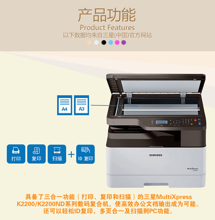• 三星K2200/5025黑白彩色激光一体机打印复印扫描办公家用A3复印机